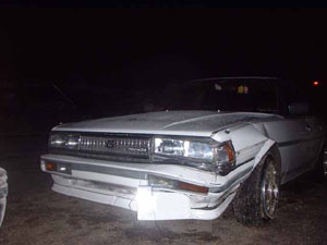 おそらく側溝の中を15メートル以上は走行したと思われ、ちょうど山側の土手と道路側の土手が狭まる場所に停止したJZX71のドアは左リヤが成人男子がやっと出られるくらいしかあかない状況でした、その時点でわかった損傷状況がバンパー及びリップスポイラーと左フロントフェンダーの破損、左フロントホイルのリム変形及びやや引っ張り気味だったタイヤがリムから脱落、右タイヤもリムから脱落、さらに右リヤホイルの軽度のリム変形でした。