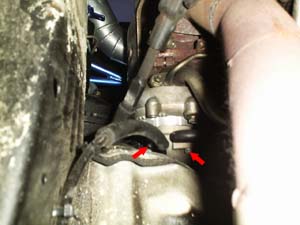 エアクリーナーからタービンまでの吸気側のパイプはほぼ全バラシが必要だと思います、私は最小限の取り外しで装着しましたが、それでもリヤ側タービンの吸気パイプははずしました、分かりづらいかもしれませんが(3)の画像がリヤ側タービンを車体の下から見た図です、赤い矢印がある部分のボルトをはずしてリヤ側タービンのインテークパイプをいったん取り外しました。